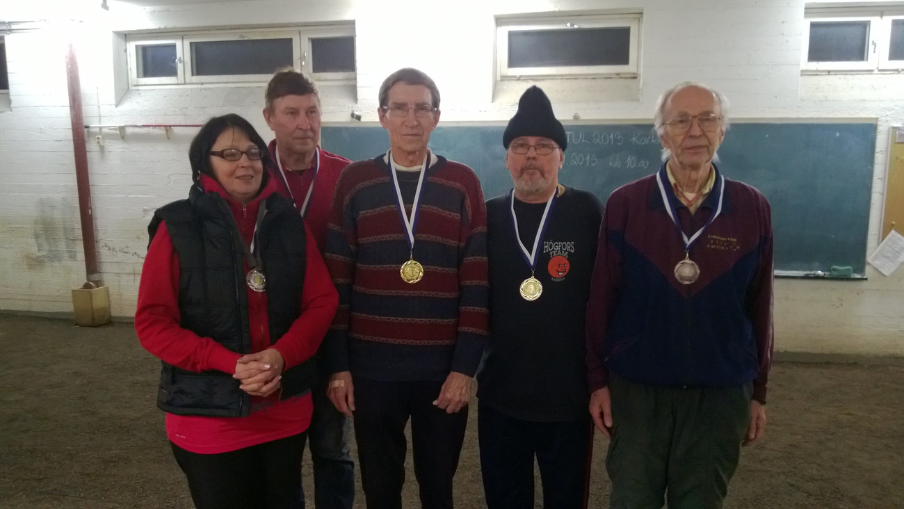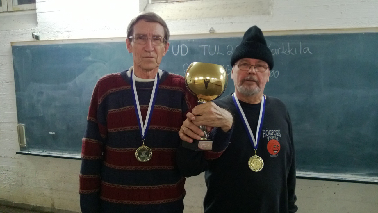 Hyvän suosion saanut ja TUL:n uudenmaanalueen yhteistyö poiki toisen kerran mukavan hallitapahtuman. Karkkilasta vuonna 2012 alkanut talvikauden kilpailu sai jatkoa myös tänä vuonna. Joukkueita oli ilmoittautunut 14 kappaletta kolmesta eri seurasta Karkkilan Urheilijat KAU, Leppävaaran Sisu LeSi ja Rekolan Urheilijat REK. Viime vuoden voittoa ja kiertopalkintoa puolustivat KAU:n Marko Taipalvesi ja Harri Lindfors. Tänäkin vuonna pari eteni helposti alkulohkosta eteenpäin, mutta tie nousi pystyyn Cupin ensimmäisellä kierroksella ja päivän ainoan tappion siinä kärsittyä, tiputti parin lopullisissa tuloksissa sijalle 5. Liekö syynä Markon kahdenkuukauden pelaamattomuus vaiko jokin muu. Viimeiseen peliin pari latasikin taasen vanhaan malliin ja voittivat LeSin ykkösparin Pentti Nikulaisen ja Harri Rinteen tylysti 13-0 Tämän vuoden Finaaliin pelasivat hienolla pelillä joukkueet KAU:lta Paula Kiiveri ja Erkki Saarinen, sekä Asko Räsänen ja Tapani Juselius. Peli eteni tasaisena aina tilanteeseen 6-6, mutta tämän jälkeen muutama huono suoritus Paulan ja Erkin joukkueelta antoi Askolle ja Tapanille avaimet voittaa peli. Näin he käyttivät myös mahdollisuuden ja hyvillä perusheitoilla ja poistoilla kuittasivat voiton 13-8. Pronssi pelissä kohtasivat Pentti Heikkonen ja Valto Enström, sekä hienosti Markon ja Harrin tiputtaneet Raili Varalahti ja Marja-Liisa Niemi. Myös tiukaksi väännöksi osoittautunut peli taipui aivan viime metreillä Pentille ja Valtolle 13-10. Lopputulokset: 1. Asko Räsänen ja Tapani Juselius KAU, 2. Paula Kiiveri ja Erkki Saarinen KAU, 3. Pentti Heikkonen ja Valto Enström KAU, 4. Raili Varalahti ja Marja-Liisa Niemi KAU, 5. Marko Taipalvesi ja Harri Lindfors KAU, 6. Pentti Nikulainen ja Harri Rinne LeSi, 7. Tauno Rahikka ja Jyrki Piitulainen REK, 8. Taito Pietilä ja Allan Degerstedt. Eräänlainen kilpailuennätyskin tuli tehtyä, joka on kyllä luokkaa josta ei kannata olla kovin ylpeä. Kilpailut aloitettiin aika tarkkaan klo 10.00 ja jokaisella oli ainakin kaksi ottelua, niin joukkue Jukka-Pekka Ropponen ja Timo Autio tippuivat kilpailusta kellon ollessa 11.30 ja ottaen vielä huomioon että he pitivät tauon otteluiden välissä. Toivotaan että pojilla kulkisi seuraavissa turnauksissa hiukan paremmin. -Marko- |