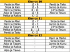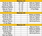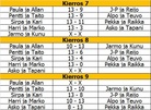 Toinen alkusarjan pelipäivä pelattiin 16.2.2013. Joka joukkueella on nyt takana 10-11 ottelua ja jäljellä 5-6 ottelua. Nyt siis alkaakin todellinen vääntö finaalipaikoista joihin siis menee A-finaaliin sijat 1.-4. ja B-finaaliin 5.-8. A-finaali paikassa ovat kiinni parhaiten tällä hetkellä ja jopa käytännössä on varmistanut sen Harrin ja Markon joukkue voittoja 9 tappiota 2. Seuraavana tulee Askon ja Tapanin joukkue 7 voittoa ja 4 tappiota. Kahdesta viimeisestä A-finaalipaikasta taistelevat sitten tasapäin kolmen voiton sisällä kaikki loput seitsemän joukkuetta, eli siis kaikki on viimeisen kierroksen varassa. Muistutus järjestys muotoutuu tasavoitoissa ensin keskinäisten pelien suhteen. Jos siinä voitot on tasan niin lasketaan keskinäisten pelien +- ja jos nekin on tasan, niin tällöin keskinäisten pelien tehdyt pisteet. Jos nekin on tasan niin tällöin lasketaan koko sarjan +-... ja jos vieläkin on jostain kumman syystä tasan lasketaan tällöin koko sarjan tehdyt, sen jälkeen aletaan arpomaan tai keksitään jotakin muuta! Ja toinen MUISTUTUS vielä: Seuraava pelipäivä on siis SUNNUNTAINA 3.3.2013 klo 10.00! -Marko- |