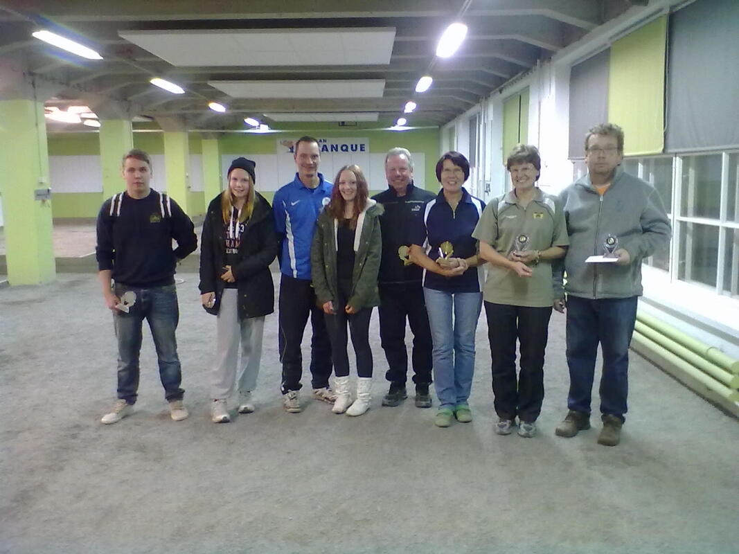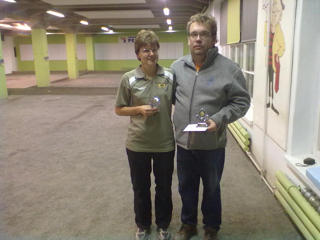 Pyhäinpäivää eli Halloweeniä vietettiin 2.11.2013 Loimaan Petanquehallilla kilpaillen sekaduppelin merkeissä. Paikalle oli saapunut ns. tupa täyteen eli 24 joukkuetta 13 eri seurasta. Paikallisia Loimaan joukkueita oli kilpailussa mukana 8 kappaletta. KAU-Petanque oli myös mukana hienolla 4 joukkueen panoksella ja kahdella seka joukkueella. Joukkueet jaettiin neljään eri lohkoon, joissa kaikissa oli siis 6 joukkuetta. Lohkojen kaksi parasta selvitti tiensä A-finaaliin, lohkojen 3. ja 4. saivat osallistumisoikeuden B-finaaliin erilliseen kilpailuun ja loput tippuivat jatkosta, jollei joku lohkon 3. tai 4. luovuttaisi paikkaansa. A-Finaaliin pelasivat puhtaalla viiden ottelun voitolla Eija Suominen (LIN) ja Marko Taipalvesi (KAU) (11-5, 13-7, 13-1, 11-10 ja 13-6), sekä Tiia Salo (KAU) ja Ville Punta (HBY). B-Finaaliin pelasivat ja parhaiten siellä pärjäsivät Paula ja Allan Degerstedt (KAU) sijoittumalla B2 ja lopullinen sijoitus 10. Toiseksi parhaimmasta sijoituksesta B-Finaalissa Karkkilalaisista vastasi Raili Varalahti ja Taito Pietilä sijoituksen ollessa B4 eli 12. Raili Pietilä ja Reijo Suominen pelasivat B-Finaalin B8 eli 16. Paula Kiiveri ja Erkki Saarinen karsiutuivat alkulohkojen jälkeen. A-Finaalissa Tiia ja Ville pelasivat hienon sijoituksen ollen 4. ja Eija ja Marko pelasivat puhtaasti finaaliin asti jossa päivän ensimmäinen ja ainoa tappio Pirjo Kiviselle ja Markku Niemiselle takasi hienon sijoituksen 2. Päivä oli pitkä ja kaikkien 8 ottelun keskittymisen johdosta en hirveästi pysty kommentoimaan kuin omia otteluita ja kirjoitankin pienen katkelman omasta pelipäiväkirjasta, Eijan kanssa taistelu hienosta 2. tilan tuomasta pelipäivästä... ... Alkulohkossa meidät oli arvottu sellaiseen joukkoon, joka muodostui meidän lisäksi kahdesta Loimaan paikallisesta joukkueesta, yhdestä KAU-petanquen joukkueesta (Raili V ja Taito), Yhdestä Valkeakosken joukkueesta (Pirjo Saarela ja Ilpo Vuorinen), sekä yhdestä joukkueesta jonka edustusta en tuntenut. Käytännössä ainoastaan kahdesta joukkueesta tiedostin heidän vahvuutensa ennen kilpailupäivää. Ensimmäisessä pelissä kohdattiin ensimmäinen Loimaan joukkue, jonka mies pelaajan Jukan ? olen joskus nähnyt pelaavat. Tiesin hänen ampuvan laaka ammuntoja, joten epäilin että hän toimii joukkueen ampujana ja nainen asettaa. Tämän pohjalta lähdettiin Eijan kanssa rakentamaan suunnitelmaa. Koska oli kyseessä ensimmäinen peli ajattelin että laitetaan kaikki rauhassa kuntoon 6-7m pelimatkalla Eija asettaa ja minä ammun. Eka kierros olikin heti mitä suunniteltiin 4-0 johtoon ja peli täydellisesti hallussa. Hyvä vire katosi kyllä yhtä nopeasti kuin tulikin ja haave helposta voitosta kuihtui. Peliaika 50min pelattiin täyteen ja jatko snadin jälkeen voittomme kirjattiin 11-5. Kaksi viimeistä hyvää päätyä meille 2-0 ja 2-0 oli ne ainoat valonpilkahdukset alun jälkeen. Toisessa pelissä kohdattiin kiven kovat Valkeakoskelaiset Pirjo ja Ilpo. Alkulohkon nimien perusteella kaavailin että jatkoon pääsyn ennakkosuosikin viittaa pitävät juuri Pirjo ja Ilpo. Vahvuudet vastustajasta tiedettiin ja tunnettiin eli sen mukaan lähdettiin pelaamaan heitä vastaan. Aika nopeasti tuli selväksi että lyhyt peli tulisi puremaan ja 7-0 meille Eijan kanssa takasi hyvän asetelman loppua silmällä pitäen. Aikaa oli tarkastella peliaikaakin ottelun tiimoilta, mutta selkeä voitto kirjattiin meille 13-7. Oma peli oli hyvin uomissaan ja tieto siitä että pystyttiin pelaamaan pitkääkin peliä hyvin, helpotti myöhempää pelistrategian luomista. Kolmannessa pelissä kohdattiin oman seuran pelaajat Raili V ja Taito. Jos kaksi ensimmäistä peliämme jouduttiin pelaamaan sellaisella vaikealla kentällä, josta puuttui ns. hiekkaa, niin nyt saatiin kenttä jossa sitä oli tarvittava määrä. Ammunta helpottuu huomattavasti, kun alustassa on hiekkaa enemmän ja pelkät poistot saavat kaverikseen myös paljon jättöjä. Tämä olikin meidän alkulohkon paras ja nopein peli, jossa kaikki pelin osa-alueet olivat Eijan ja minun kontrollissa. Eija paineisti vastustajan huippu asetuksilla ja tarvittavat poistot heitin itse. Kun vastustajan kuulat olivat alhaalla, niin Eija asetti tarvittavat pisteet ja hyvinkin nopeasti taululla oli lukemat 13-1. Jos ammunnoissa heitin 1-2 hutia koko kierroksen aikana, niin sama prosentti oli Eijan asetuksissa. Huippu peli meiltä, sääliksi kävi vain että häviävänä puolena oli seurakaverit. Tälläisiä pelejä tule juuri silloin kun pystyy pelaamaan täysin rennosti ilman huolta ja valitettavasti yleensä seurakavereita vastaan peli on sillä tasolla. Nyt se vain pitäisi osaa muuttaa muitakin vastaan samanlaiseksi. Neljännessä pelissä kohtasimme paikallisen Loimaan toisen joukkueen Eila Nummilan ja Ossian Lindmanin (Sepon isä!). Aikaisempaa kokemusta ei pelaajista ollut, mutta pieni vakoilu oman pelin ohessa takasi sen tiedon että Eila ampuu ja Ossian asettaa. On sanottavakin että Ossianin asetukset olivat todella korkealaatuisia ja huonon asetuksen jälkeen hän osasi parantaa heittoa tarpeeksi aina seuraavaa silmälläpitäen. Pääsimme heti alussa hyvään lentoon Eijan kanssa ja kun peliaika oli loppu, niin viimeiseen snadiin lähdettiin 11-7 meidän johdossa. Ajateltiin että kyllä se riittä, kun vain heitetään pääty ja kätellään. Mutta niinkuin aina tässä vaiheessa, tällaisilla ajatuksilla ei kaiva kuin hautaa itselleen. Meidän huonot asetukset ja ammunnat takasivat vastustajalle suoran voiton paikan, puhumattakaan tasuri tilannetta ja tällöin yhden jatkolisäsnadin ratkaisua. Panoksenahan oli koko lohkon voitto, eli oli tärkeää voittaa tämä peli. Jos meillä oli huono pääty, niin eipä vastustajakaan onnistunut odotetusti ja saivatkin vain 3 pistettä viimeisestä päädystä, joka ei riittänyt. Neljäs voitto meille lukemin 11-10. Alkulohkon viimeisessä päädyssä, kohtasimme tuntemattomaksi jääneen vastustajan. Jos ymm