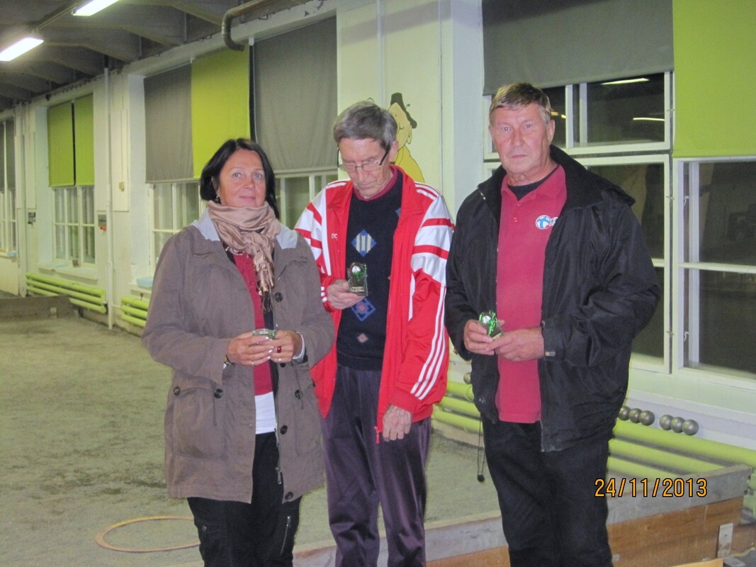 Sunnuntaina 24.11.2013 pelattiin Loimaalla Vesikoskitalossa Veteraanien trippelikilpailu. Paikalle oli saapunut 10 joukkuetta, 4 eri seurasta. KAU-Petanquesta oli kilpailuun mukaan lähtenyt neljä joukkuetta. KAU-Petanquen parhaasta sijoituksesta vastasivat A-finaalin neljänneksi pelanneet Paula Kiiveri, Erkki Saarinen ja Asko Räsänen. B-finaalin voitto ottettiin sitten Karkkilaan Raili ja Taito Pietilän, sekä Pentti Heikkosen toimesta. B-finaalin pronssista kilvoittelivat myös KAU-Petanquen kaksi joukkuetta joista kolmannen tilan pelasivat Paula ja Allan Degerstedt sekä Alpo Kärkäs ja neljänneksi tällä kertaa jätettiin Raili Varalahti, Reijo Suominen ja Timo Lingman. Seuraava koitois onkin sitten Heiskasen Pertin kotitantereella Turussa 8.12.! -Marko- |