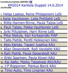 Kauden 2014 toiset kaupunginmestaruuskilpailut saatiin pidettyä 14.6.2014 Harjunpallokentällä. Kisat olivat jäähyväiskilpailut hyvin palvelleelle kentälle. Maanantaina 16.6. kenttä suljetaan kolmeksi vuodeksi ja se tulee toimimaan tänä aikana koulusaneerauksen työmaakenttänä. Osa kentästä tulee jäämään uuden koulukiinteistön alle ja osa tullaan madaltamaan rajusti entisestään. Eli jos kolmen vuoden päästä pääsemmekin takaisin vanhalle paikalle, on se muttunut erittäin radikaalisesti näistä ajoista. Tästä eteenpäin kenttämme löytyykin siis Lehtolankadun varrelta ns. ”tiilitehtaankenttä”. Mutta tärkeimpään eli kaupunginmestaruus duppelin kimppuun. Paikalle oli saatu taasen hyvä ryhmä kilpailijoita ja taso oli mestaruuskilpailuksi kova. Joukkueita ilmoittautui 14 joukkuetta seuroista LeSi, MAP, ANJ ja KAU, joista lievästi ennakkosuosikin viittaa kantoivat MAP:n Mika Nietula ja Kari Korkeamäki ja heidän vanavedessään Anjalankosken Kai Aalto ja Karkkilan Marko Taipalvesi. Mustina hevosina ja hyvänä päivänä myös Leppävaaran Pauli Talpia ja Pekka Vauhkonen olivat myös laskelmissa, eikä ulos laskelmista voinut jättää myöskään Karkkilan Taito Pietilän ja Pentti Heikkosen kotikentän tuntemusta. Peli simuloitiin aivan SM2014 kilpailujen muotoon. Ainoona erona on että Haminassa joukkue määrät ovat isommat, mutta periaate on aivan sama kuin meillä oli. Kolme kierrosta Swiss-systeemillä ja sijoitus 16 Cup kaavioon. Meillä siis tällä kertaa kaikki pääsivät jatkoon, kun ei ollut kuin 14 joukkuetta! Alkupelien Swiss-kierroksien jälkeen 1. pelasivat J-P Ropponen ja Markus Barck KAU, 2. Kai Aalto ja Marko Taipalvesi ANJ/KAU, 3. Pauli Talpia ja Pekka Vauhkonen LeSi, 4. Alpo Kärkäs ja Tapani Juselius KAU, 5. Paula Kiiveri ja Erkki Saarinen KAU ja 6. Mika Nietula ja Kari Korkeamäki MAP. Cup-kierroksella ennakkoon kovimmat pitivät pintansa. MAP:n Mika ja Kari tiputtivat Leppävaaran Paulin ja Pekan 13-5, sekä Karkkilan J-P ja Markus tiputtivat Karkkilan Taiton ja Pentin 13-10. Välierässä kohtasivatkin J-P:n ja Markuksen joukkue, joka sai vastaansa Raili Pietilän ja Paula Degerstedtin joukkueen. Voitto tästä J-P:lle ja Markukselle 13-8. Toisessa välierässä mittaa ottivat MAP:n Mika ja Kari, jotka saivat vastaansa Kain ja Markon. Kai ja Marko voittoon 13-6 ja finaaliin. Finaalissa J-P ja Markus saivat paremman startin ja karkasivat 7-2 johtoon. Vielä yritettiin, mutta päivän huonoimmalla pelillä ei voitu mitään totesi Marko. Voitto J-P:lle ja Markukselle 13-8. Pronssi matkasi MAP:n mukana hyvinkää-Riihimäki akselille Mikalle ja Karille lukemin 13-9. Lopputulokset: