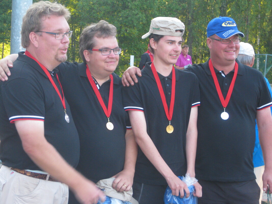 Elokuu 2015 puolessa välin ja TUL:n vuoden huipennus edessä! Lauantaina 15.8.2015 järjestettiin Jyväskylässä, Tikan koulun kentällä TUL:n duppelimestaruuskilpailut. Pelattavina sarjoina oli Yleinen duppeli, sekä Naisten duppeli. Kuten aina jo muutaman vuoden ajan tapahtuma on ollut seurallemme yksi tärkeimmistä kesän peliviikonlopuista, kuten aito SM-kisaviikko. SM-kisaviikko antoi jo esimakua huikeille suorituksille ja onnistuneille tuloksille ja tästä oli siis hyvä jatkaa... Lauantain kisapäivä alkoi jo monelle KAU-Petanquen pelaajalle perjantaina siirtymisellä Jyväskylän liepeille majoituksen ja yhdessä olon merkeissä. Osa vanhemmasta porukasta lähti matkaan jo perjantai aamuna ja jotkut vasta lauantai aamuna. Meidän nuoremman poppoon yhteinen kisaprojekti käynnistyi iltapäivästä Nummelasta, josta suunnaksi Hyvinkää ja tämän jälkeen nokka kohti Jyväskylää jossa viimeisin kaveri saatiin kyytiin linja-autoasemalta. Kisapaikalle tutustuminen oli iltaohjelmassa ja tämän jälkeen kaupan kautta siirryimme Rannan hovin apartementokseen yöpymään, jossa yksityistilaisuus pilasi saunomisidean, mutta kävihän sentään Antti kokemassa hyisen järviveden viileyden. Kilpailuun oli ilmoittautunut kaikkiaan 42 yleisen joukkuetta ja 12 naisten joukkuetta. Seuramme oli ilmoittanut kilpailuun kaikkiaan 8 joukkuetta, 5 yleisessä ja 3 naisissa. Pelit pelattiin TUL:n sääntöjen mukaisesti lohkomuotoisena ja alkupelejä kaikille tuli vähintään kaksi osalle kolme. Alkukierroksien jälkeen A-sarjaan pelasi kaksi joukkuetta Karkkilasta, kummatkin puhtaalla pelillä. Petrille ja Antille oli arvottu kolmen joukkueen lohko ja pojat hoitivat sen puhtaasti huippu pikkupisteillä, näin ollen suora A-sarjan jatkopaikka oli selviö. Toisesta jatkopaikasta A-sarjaan vastasivat Marko ja Jyrki, jotka olivat arvottu neljän joukkueen lohkoon ja sieltä kirjattiinkin suoraan kolme voittoa tuloksin 13-0, 13-12 ja 13-0. Alkukierroksien tuloksien valossa kummatkin Karkkilan joukkueet sijoittuivat jatkokaaviossa, niin että mahdollinen yhteenotto oli vasta finaalissa! Kolmen muun joukkueen tie vei C-sarjaan eli joukkueet, Taito ja Allan, Teuvo ja Erkki, sekä Alpo ja Tapani. C-sarjassa seuramme omat joukkueet joutuivat sitten mittelemään voimiaan keskenään ja loppusijoitukset olivatkin C-sarjan 5., 7. ja 8. kokonaistulokset tällöin 29., 31. ja 32. A-sarjassa Karkkila pistikin sitten tuulemaan ja joukkueita ei pysäyttänyt mikään, vaikka välillä oli hilkulla. Kummatkin joukkueet pelasivat voitosta voittoon ja niin oli valmis ”unelmien unelma” todellinen ”dream of final” Opettaja vastaan oppipoika ja pikkuveli vastaan isoveli! Myönnettäköön että fiiliksen saanti tähän finaaliin ei ollut ihan samanlainen kuin muita vastustajia vastaan, mutta mitään ei silti tulla antamaan ilmaiseksi. Petri ja Antti olivat pelaneet kokopäivän huippu petanqueta ja tiputtaneet matkan varrella todella kovia porukoita. Tämän saivat kokea niin Aallon Kaitsu ja Lohmanin Petri, kuin Sirpa ja Kari Korkeamäki. Välierässä he voittivat selkeästi joukkueen Pertti Rinkkala ja Tarmo Sipilän. Alkukierroksien jälkeen povasinkin heille voittoa, jos pelaavat omalla tasolla ilman turhia paineita ja jännitystä. Meillä Jyrkin kanssa oli astetta helpompi vastustaja arsenaali, mutta niin pirullisen nälkäinen ja paikkakunnan omia joukkueita, jotka saivat yleensä kovan kannatuksen omilta katsojiltaan, joten oma pää piti siis kestää. Meidän kovimmat päänahat olivatkin Vesa Karttusen ja Pekka Lähteelän voitto alkusarjassa 13-12 jota oltiin häviöllä 8-12, sekä välierässä Alpi Kylmäsen ja Erkki Metsän voitto 9-11 tilanteesta 13-11 ottaen huomioon että viimeinen pääty aloitettiin kahdella reiällä jonka jälkeen vastustaja tuhlasi peräti neljä asetuskuulaa saamatta pistettä. Eikä koskaan pidä unohtaa Ukkolan Riston ja Järvisalon Sepon vastusta puolivälierässä. ”Dream of final” oli siis valmis alkamaan! Teikkauksen voittivat Petri ja Antti. Snadi vietiin heti lyhyelle matkalle ja silloin vietiin Markoa ja Jyrkiä. Poikien peli oli virheetöntä ja hetkessä taululla 6-0 lukemat kahden päädyn jälkeen. Onneksi onnistuttiin seuraavassa päädyssä saamaan piste ja snadi meille. Päätettiin viedä peli heti pitemmäksi, päälle 9m! Tämä puri ja peli tasoittui tilanteesta 8-2 aina meidän johtoon asti 9-11. Seuraavassa päädyssä nähtiin ratkaisu. Snadi n. 8,5m ja Petri asetti kiinni snadiin. Jyrki poisti ja Marko asetti hyvän ykkösen. Tähän Antti vastasi karolla. Marko asetti toisen ja ykköseksi Antin kuulan viereen. Antti vastasi poistolla. Heillä näkyi kaksi ja kolme kuulaa jäljellä, meillä kolme kuulaa jäljellä. Marko asettaa viimeisen ja ykköseksi. Antti ampuu poiston ja edelleen heillä näkyy kaksi. Jyrki asettaa ykkösen ja tähän Petri vastaa karolla, heillä näkyy kolme ja kummallakin yksi kuula jäljellä. Jyrki aprikoi hetken mihin asettaa ja asetus jää karvan lyhkäseksi ja antaa vastustajalle mahdollisuuden katkaista. Petri asettaa kylmän viileästi pisteen ja peli poikki Petrille ja Antille 13-11. Hieno peli ja parempi voitti! Kaksoisvoitto Karkkilaan, joka on upea saavutus seurallemme. Naisten duppelissa alkulohkoja oli kolme ja lohkojen kahdelle parhaalle oli jaossa jatkopaikka A-sarjaan ja muut B-sarjaan. Kaikki KAU:n joukkueet pelasivat hyvät alkupelit ja jatkot A-sarjassa lunastivat joukkueet Paula D ja Eija, Raili V ja Marja-Liisa, sekä Raili P ja Paula K. Tällä kertaa finaaliin pääsy oli liikaa, mutta Eija ja Paula D pelasivat itsensä pronssipeliin, jonka he voittivat selkeästi 13-0 ja näin ollen mitallisade KAU-Petanquelle jatkui. Sijoituspelissä 5.-6. kohtasivat muut Karkkilan joukkueet. Tälläkertaa voiton vei Raili P ja Paula K heille sijoitus 5. ja sijoitus 6. pelasi Raili V ja Marja-Liisa. TULOKSET: MIEHET A-SARJA 1 Petri Taipalvesi ja Antti Pasanen Karkkilan Urheilijat 2 Marko Taipalvesi j