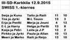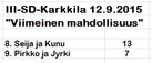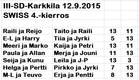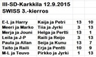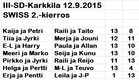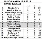 III-SD Karkkila (SekaD) Karkkila 12.9.2015 Aurinkoinen syyssää helli pelaajia koko päivän ja pelit saatiin pelattua upeissa olosuhteissa. Alkupelit pelattiin 4.-kierroksen swiss systeemillä, sekä ns. Viimeinen mahdollisuus kierroksella + A/B-cup finaalit. Swiss-kierroksien jälkeen johtopaikka pitivät hallussaan juniori maajoukkuepelaaja Tiia Salo ja valmentaja isä Jyrki Salo. Toisena olivat Turusta Loimaalle siirtynyt ja ensimmäisen kerran Karkkilan kenttään tutustunut Meeri Käkelä ja Marko Taipalvesi. KAU-petanquelta A-sarjaan pelasivat myös Paula ja Allan Degerstedt, Raili Varalahti ja Reijo Suominen, sekä Kaija Vauhkonen LeSi ja Petri Taipalvesi. Tiia ja Jyrki pelasivat vakuuttavasti koko päivän ja näin ollen heille vakuuttava finaali voitto Meeristä ja Markosta. Pronssin veivät Karkkilalaisparin Railin ja Reijon hyppysistä Eija-Liisa ja Harry Kalvolaan. Lopputulokset: 5.-8. Seija Sillanpää LIN ja Kunu Wallin LIN 5.-8. Paulla Degerstedt KAU ja Allan Degerstedt KAU 5.-8. Merja Salonranta PCP ja Jouni Heinonen PCP 5.-8. Kaija Vauhkonen LeSi ja Petri Taipalvesi KAU B2. Helga Laakso LeSi ja Pertti Harinen LeSi B3.-4. Erja Ståhl KIS ja Pentti Ståhl KIS B3.-4. Raili Pietilä KAU ja Taito Pietilä KAU B5.-6. Marja-Liisa Niemi KAU ja Teuvo Niemi KAU B5.-6. Leila Pirttilahti LeSi ja J-P Ropponen KAU |