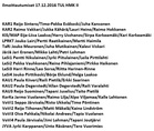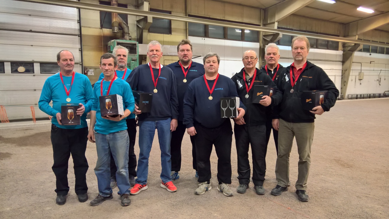 TUL Hallimestaruuskilpailu 2016 TULOKSET 1. Jari Eronen, Mikko Lahti ja Petri Lohman (Järvelän Jänne, Järvelän Jänne ja Voikkaan Viesti) 2. Reijo Sintero, Timo-Pekka Eväkoskija Juha Kansonen (Karhu Petankki) 3. Oiva Pahkala, Nikolai Andreev ja Tapio Vuolanen (Voikkaan Viesti) 4. Seppo Järvisalo, Risto Ukkola ja Timo Pöntinen (Voikkaan Viesti) 5. -8. Jarmo Vuolanen, Raimo Lilja ja Alpo Viljamaa (Korson Kaiku) Paula Degerstedt, Raili Varalahti ja Allan Degerstedt (Karkkilan Urheilijat) Jouko Meuronen, Juha Mutikainen ja Kalevi Viskari (Taipalsaaren Riento) Jyrki Karppanen, Unto Räsänen ja Tero Vuorimies (Jyväskylän Valo) 9. (B1.) Eija-Liisa Laakso, Sirpa Korkeamäki, Harry Uschanov ja Kari Korkeamäki (Kalvolan Isku, MAP-Raime) 10. Pirkko Haikonen, Pekka Vauhkonen ja Reino Pihlajaniemi (Leppävaaran Sisu) 11.-12. Paula Kiiveri, Raili Pietilä ja Erkki Saarinen (Karkkilan Urheilijat) 11.-12. Helga Laakso, Jouko Pirttikoski ja Börje Eklund (Leppävaaran Sisu) 13. Jouko Lairi, Pertti Raatikainen ja Martti Haimila (Lappeerannan Kisatoverit) 14. Reijo Tiihonen, Matti Mäkelä ja Kaino Lindström (Voikkaan Viesti) 15. Paula Järvisalo, Jimi Lohman ja Tapani Joutjärvi (Voikkaan Viesti) 16. Reijo Suominen, Tapani Juselius ja Taito Pietilä (Karkkilan Urheilijat) 17. Leila Pirttilahti, Pentti Nikulainen ja Jyrki Piitulainen (Leppävaaran Sisu) 18. Raimo Vakkari, Jukka Kähärä, Lauri Heino ja Raimo Hokkanen (Karhu Petankki) 19. Riitta Harinen-Rinne, Harri Rinne ja Leo Sorsa (Leppävaaran Sisu)
