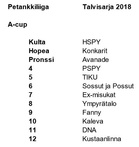 Tammi-Helmikuun aikana pelattiin perinteinen Helsinginfirmaliiga, joka nykyään tunnetaan myöskin Talvisarjana tai Talviliigana. Mukaan oli taasen saatu täydet 24 joukkuetta ja KAU-Petanquen firmana toimi jälleen Helsingistä Avanade kolmatta vuotta. Joukkueessa pelasivat Petri Taipavesi, Markus Qvist, Jarkko Volotinen, Olli Tehikari, Jyrki Salo ja Marko Taipalvesi. Hienoa oli tällä kertaa että Avanadesta oli saatu kaikkiaan neljä pelaajaa tutustumaan lajiin ja pelaamaan kilpapetanqueta. Joukkueet olivat jaettu kahteen lohkoon ja illassa pelattiin kolme ottelua + sarjan päätteeksi finaali ilta. Avanaden joukkue pelasi itselle alkusarjassa sijoituksen 2. ja suoraan finaali illan jatkopeleihin. Tänäkin vuonna pelattiin hieno alkusarja ja finaalissa vain yksi tappio pudotti joukkueen finaalista pois, mutta nälkäisenä joukkue hoiti hienosti pronssi mitallin kotiin. Hieno sarja ja uudet kasvot pelasivat hyvää peliä! |