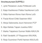 Tänään 9.6. pelattiin Karkkilan Tiilitehtaan kentällä avoin Kaupunginmestaruuskilpailu, pelimuotona duppeli. Kilpailuun osallistui 9 joukkuetta viidestä eri seurasta (KAU, PCP, LIN, KAL ja LeSi). Kilpailu vedettiin lävitse lohko-muotoisena (2 lohkoa), joista kaksi parasta mitallipeleihin ja loput sijoitus otteluihin. Tulokset: 1. Marko Taipalvesi ja Gunnar Wallin KAU/LIN 2. Merja Salonranta ja Jouni Heinonen PCP 3. Kaija Vauhkonen ja Pekka Vauhkonen LeSi 4. Paula Kiiveri ja Erkki Saarinen KAU 5. Jyrki Piitulainen ja Jouko Pirttikoski LeSi 6. Reijo Suominen ja Pertti Harinen KAU/LeSi 7. Riitta Harinen-Rinne ja Harri Rinne LeSi 8. Raili Varalahti ja J-P Ropponen KAU/KAL 9. Tapani Juselius ja Alpo Kärkäs KAU KAU-Petanque kiittää osallistujia mukavasta pelipäivästä ja tällä kertaa sää oli todella suosiollinen. Onnittelut menestyjille ja hyvää kesän jatkoa.