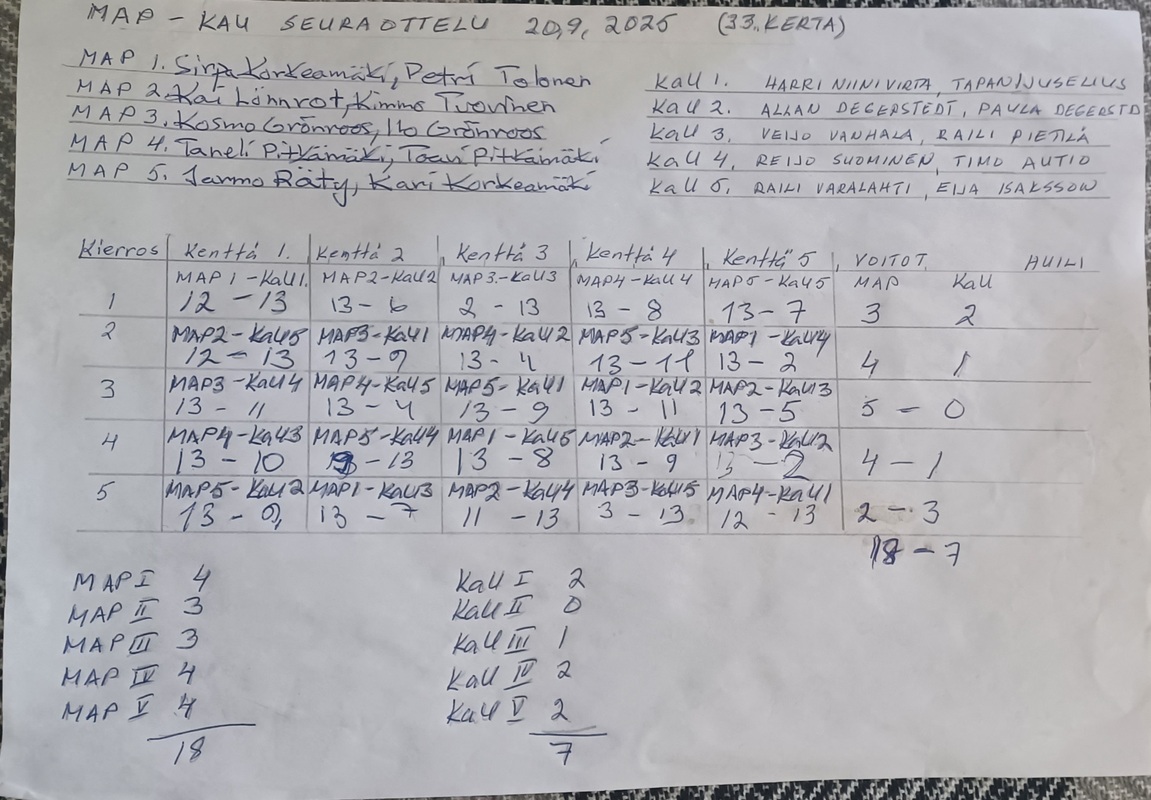 Riihimäen hallinta jatkui Turnaus pelattiin 20.9.2025 yhteensä kymmenen duppelijoukkueen voimin Tehtaanpuiston kentällä. Sateinen ja kylmä sää väistyi vasta iltapäivällä auringonpaisteeseen. Jo totuttuun tapaan Riihimäki toi "kivilaatan" paikalle aamulla ja vei sen mukanaan iltapäivällä. Laatasta voi tavailla voittojen suhteet. Kiitämme jälleen kävijöitä! |
